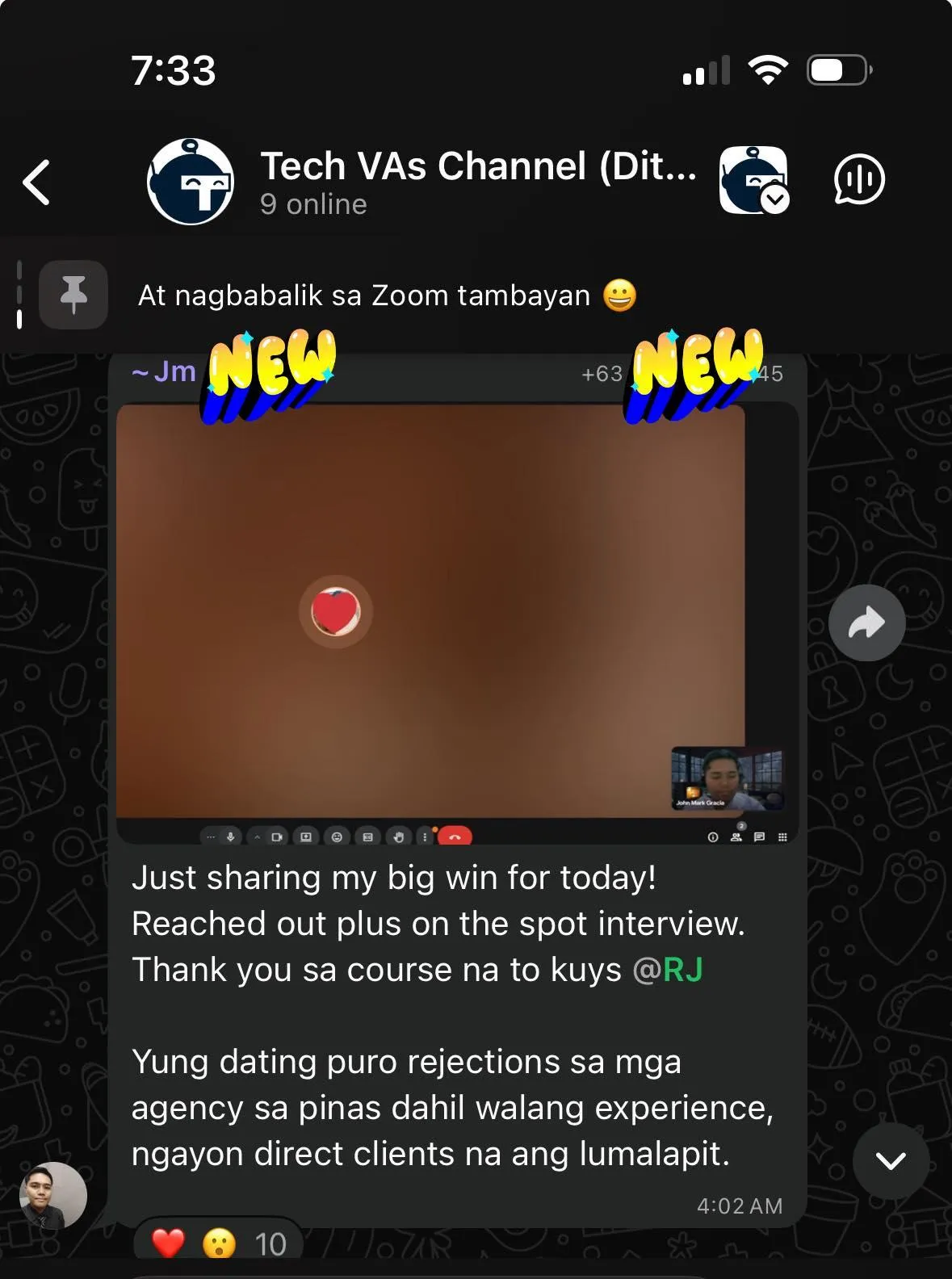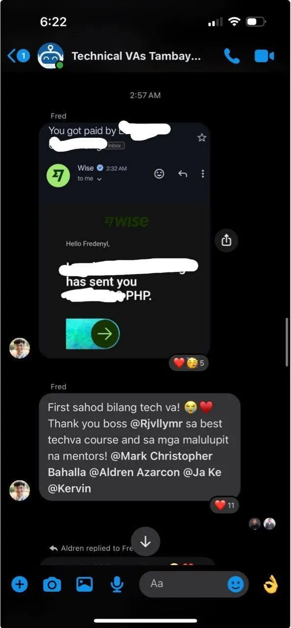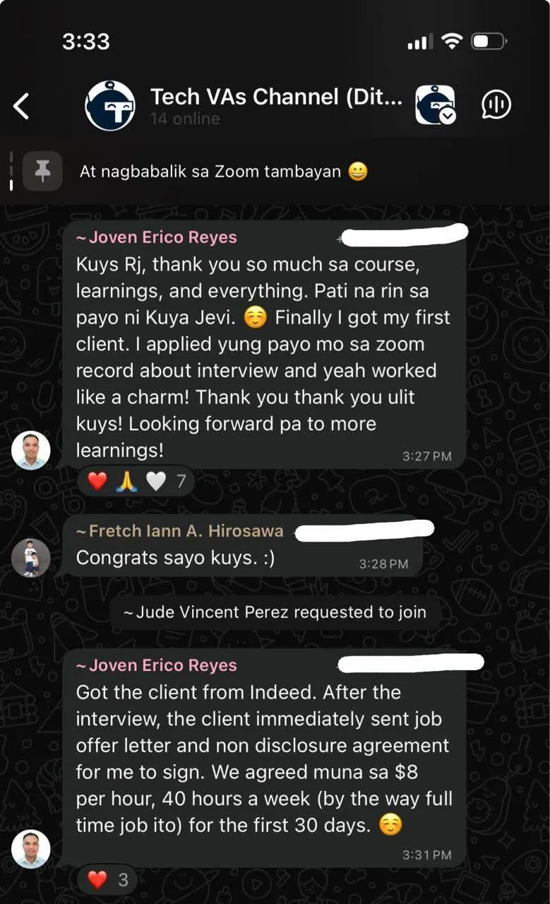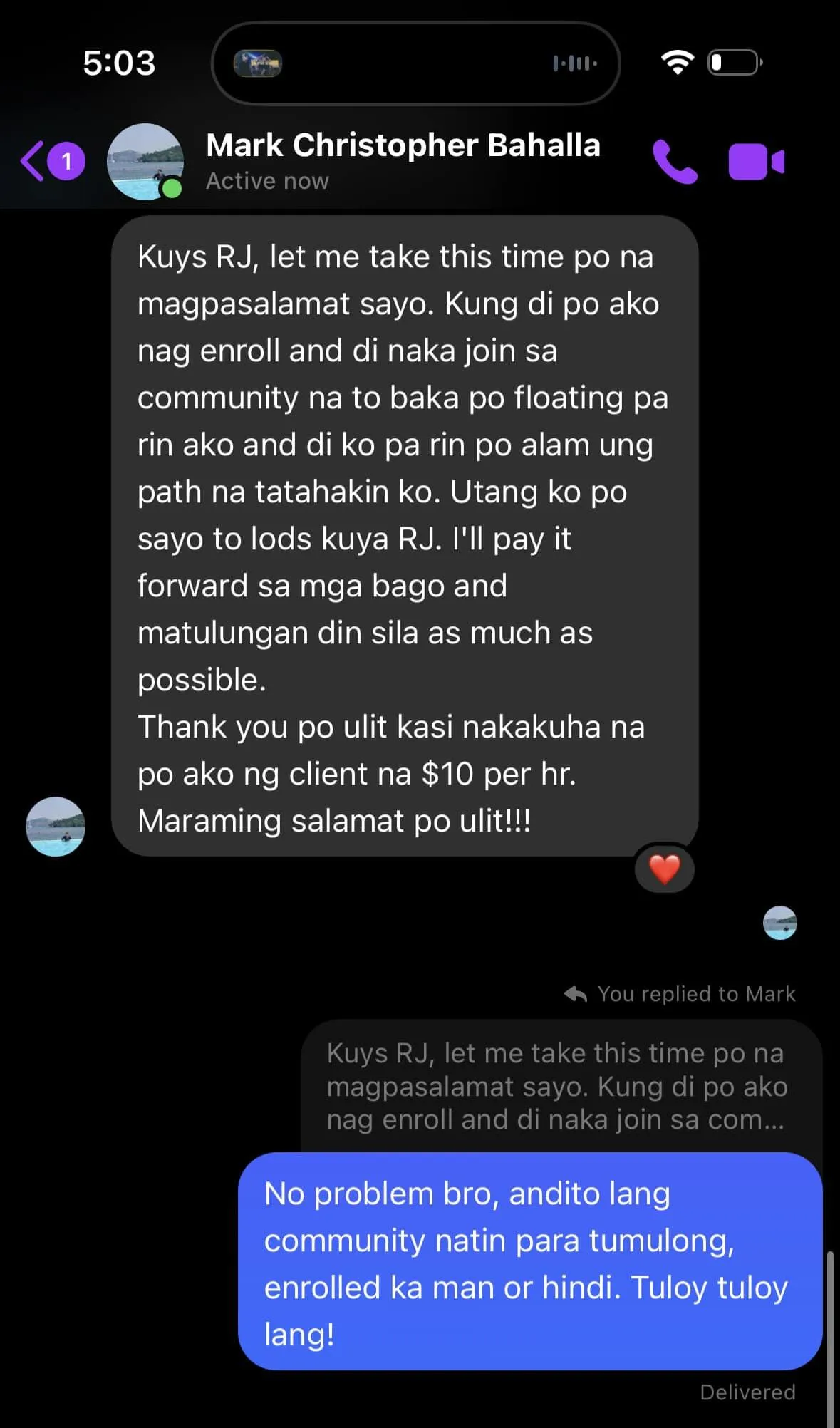 "Kahit 17 years old and student palang ako, nakaland na agad ako ng multiple clients with the help of Kuys RJ and Tech VA community. Sobrang solid ng daily zoom tambayan, pag may tanong ako sa course nasasagot agad. Solid!"