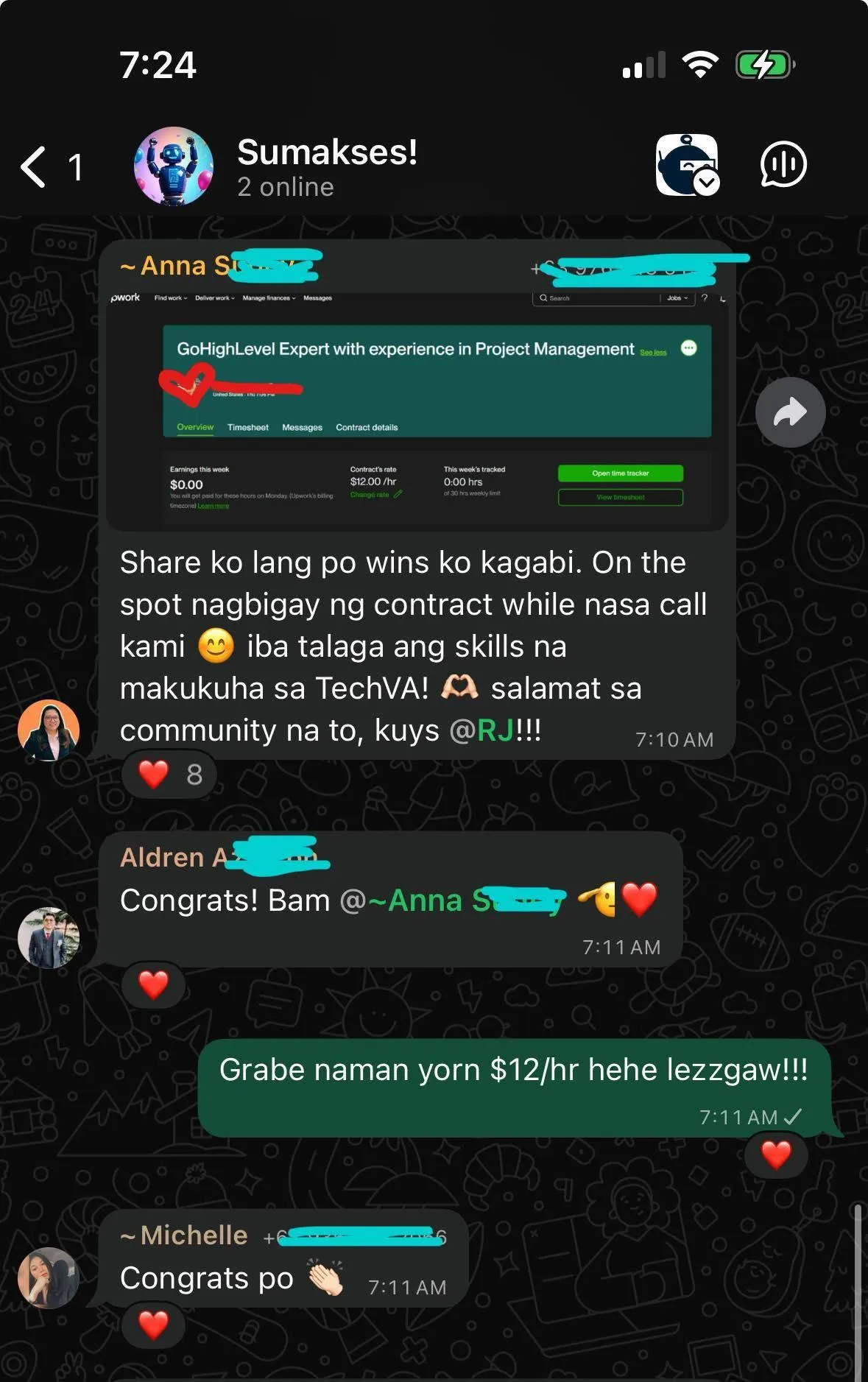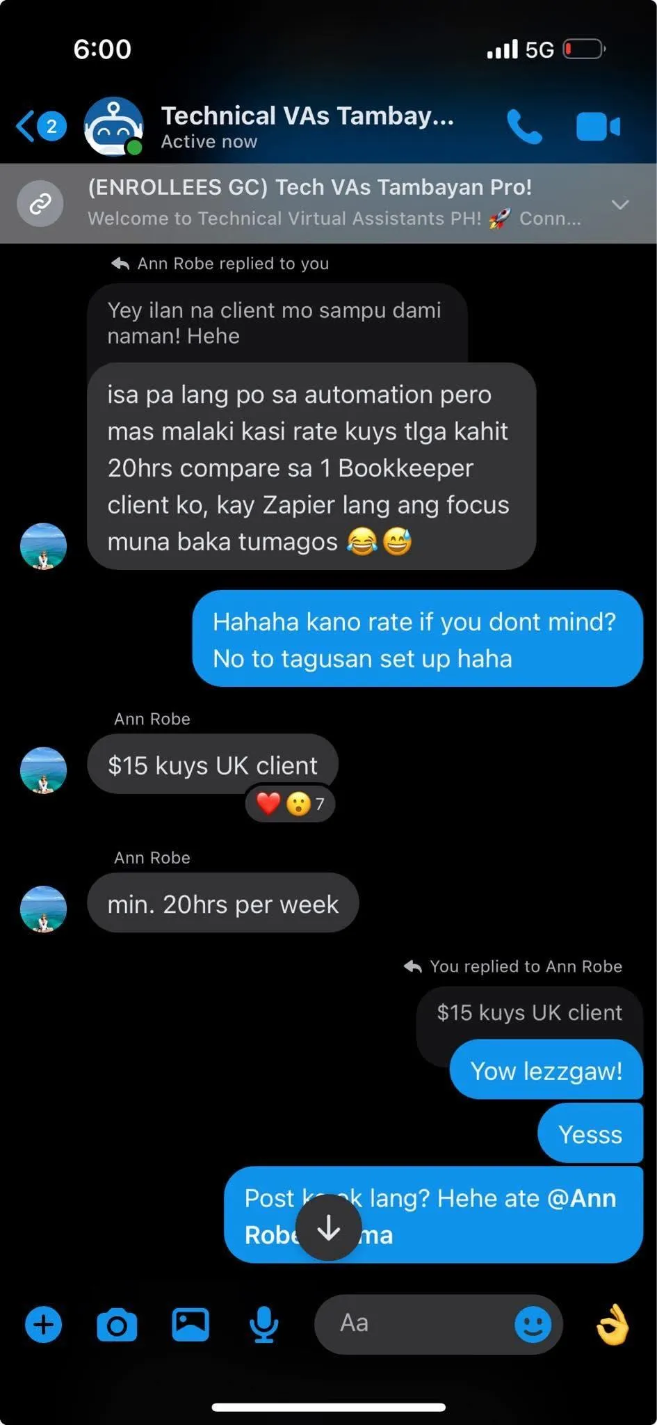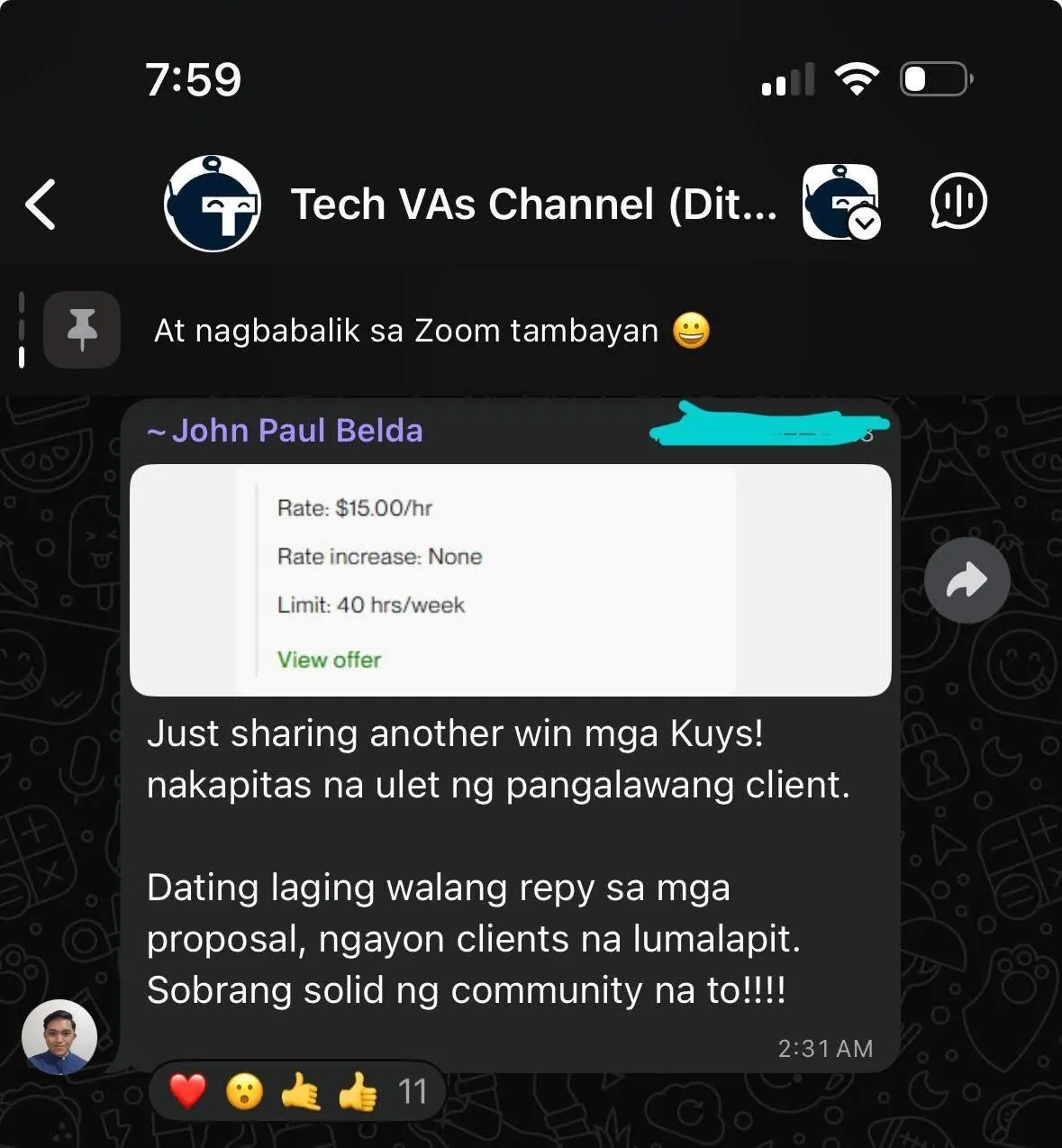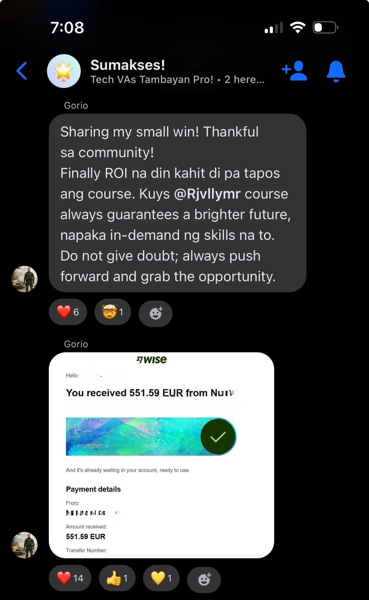 "Kahit 17 years old and student palang ako, nakaland na agad ako ng multiple clients with the help of Kuys RJ and Tech VA community. Sobrang solid ng daily zoom tambayan, pag may tanong ako sa course nasasagot agad. Solid!"